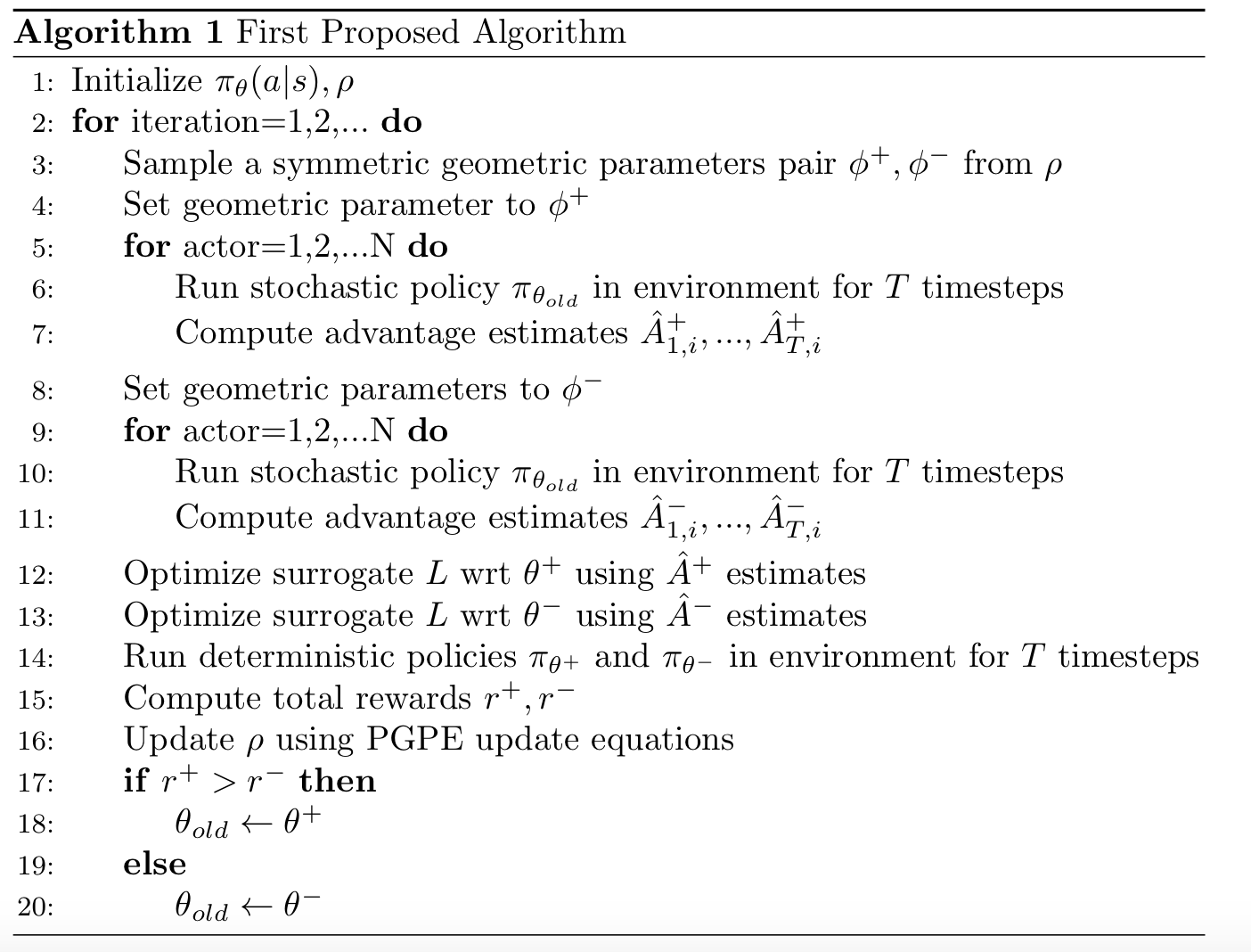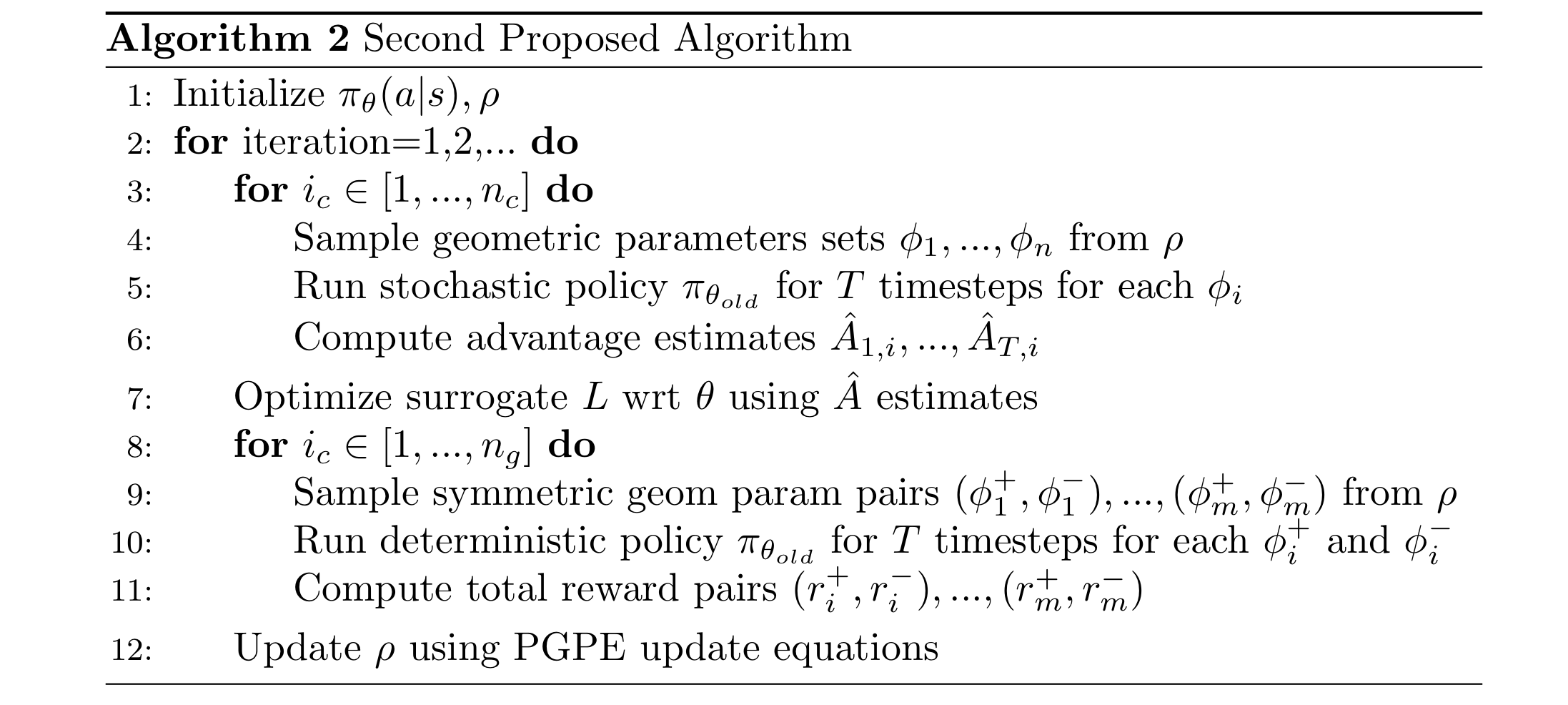 [1] does not seem to mention whether the policy that is used for the geometric parameter optimization is deterministic or stochastic. Christian and I hypothesize that using a deterministic policy for the geometric parameter optimization will result in a less noisy gradient for updating the parameter distribution. This is the main difference between this algorithm and the one in [1]. In addition, the paper does not indicate whether the PGPE they used is SyS-MultiPGPE or just MultiPGPE without symmetric sampling. Our algorithm explicitly uses SyS-MultiPGPE.