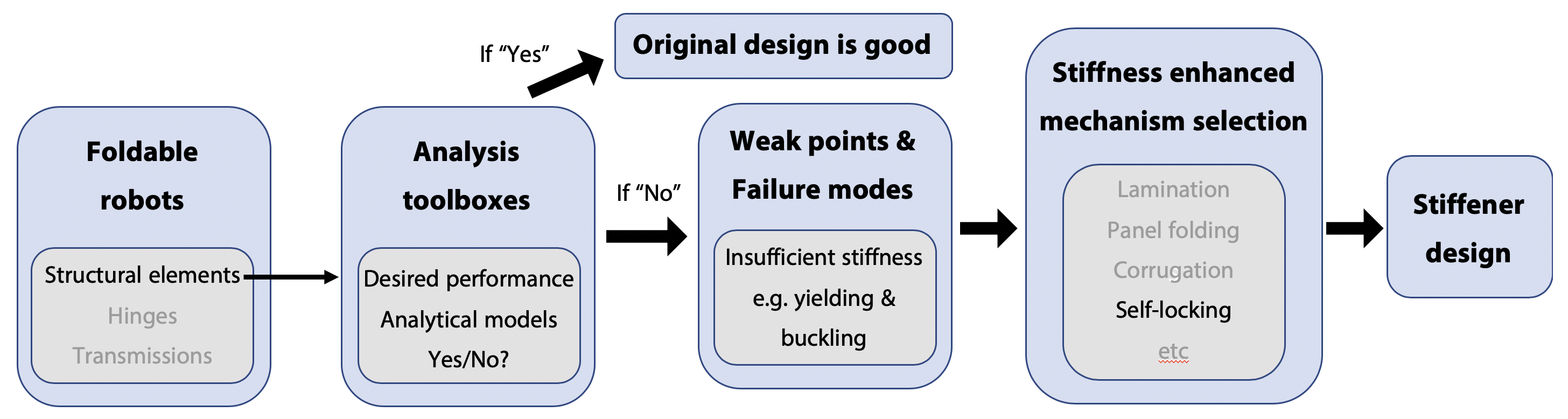 For the next two months, I will be focusing on designing structural elements, which is a major component in foldable robotic systems. I will build analysis design toolbox that will determine whether current design is sufficient to meet desired performance. If so, we will keep the current design. If not, the toolbox will tell us the weak points and failure modes so that we can design stiffeners (stiffness enhance mechanisms) correspondingly. The stiffener design process will follow the same design paradigm as what we have done for the currugated mechanism. The project goal for ICRA 2021 is shown below.