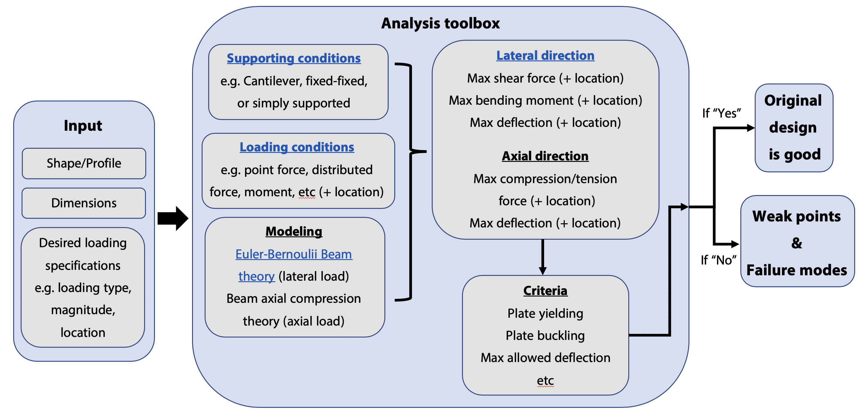 The goal for next two weeks is to develop a design toolbox for structural elements that (1) takes profile, dimensions and loading specification as inputs; (2) determine system stiffness; (3) determine whether the system will fail or not. If toolbox output shows current design satisfies the loading specification, no other steps needed; if not, the toolbox will output weak points and failure mode for future development.