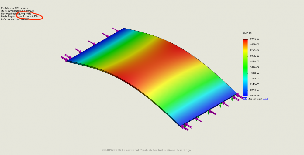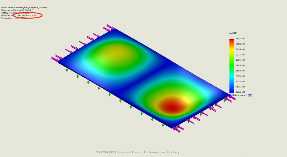 - Critical buckling load from analytical solutions: 4212N/m along the short edges, or 210N on short edges or 84240 N/m^2 on short edges. Also there should be two half-waves across lengthwise direction and one half-wave along widthwise direction.