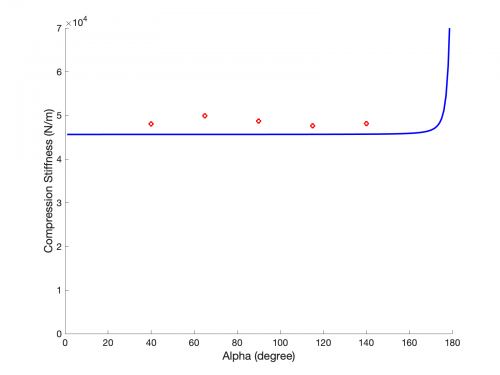 - Note: I planed to do one experiment to test the case when alpha = 180 deg, which gives us a flat square. Based on the buckling analysis I researched on a month ago, the approximate buckling load for the square is around 2.5N, which matches the behavior I noticed during the compression experiment. However, the experiment setup / machine can not capture the the stiffness for that small load and moving range. So, no cases at alpha = 180 deg are included in the result.