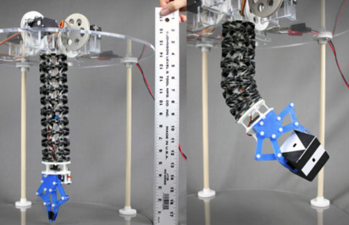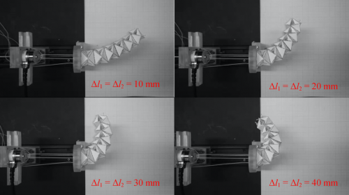 1. Zhang et al. 2016: continuum robotic arm. This origami arm can provide large bending and extension movement. But it does not have the capability to lift weight or carry an end-effector, due to the lack of body stiffness. If adding stiffness by some traditional ways (e.g. lamination), the weight of the origami arm will increase, and performance will not be as good.
