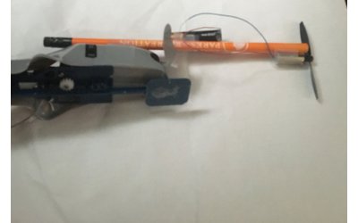 It uses a AAA battery and the motor mounted to a pencil with tape. I mounted the system to the center gondola of my design. I stripped the wires and bent them such that when I put them in the right position, the motor would turn on.