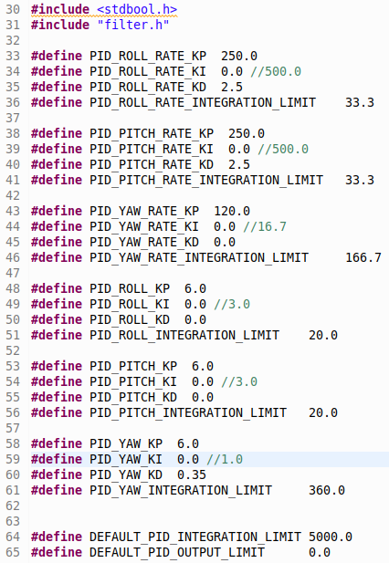 Removing Integral Control: Considering all of this, I decided to remove integral control from the crazyflie by setting all k_i (integral gains) to zero. To do this, I modified the crazyflie firmare in the 'pid.h' file (the process for modifying firmware is discussed in my previous blog post). The modifications can be seen in the image below (commented values are the original gains).