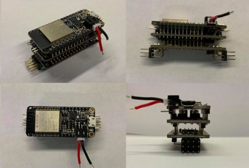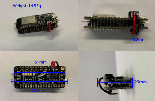 The feather board stack is a little bit heavy (22.3 g) so I tried the soldering way to assemble different motor board and esp32 feather board, which is only 14.55 g as shown in the following figure: