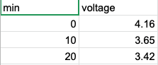 The initial voltage of the 3.7v battery is 4.16v, which is fully charged. And I measure the voltage of the battery every 10 minutes because as the battery discharges, the output voltage will decrease. The lowest safe discharging voltage of a 3.7v lipo battery is around 3.4v.