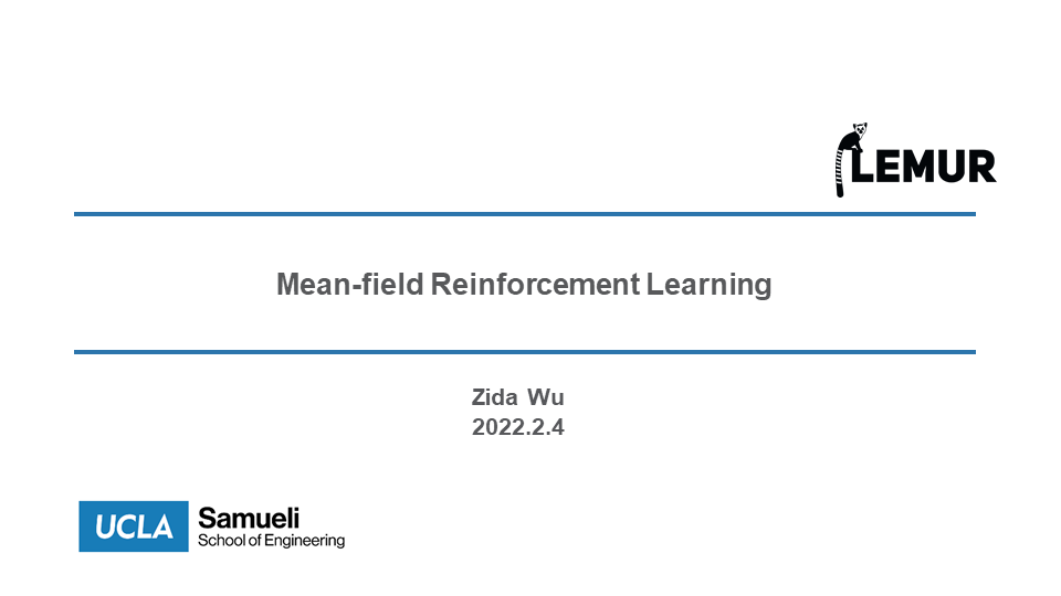 Zida Wu reinforcement learning; multi-agent; mean-field;These slides are presented in group meeting. Talking about the evolution from individual Reinforcement Learning towards multi-agent mean-field algorithms.