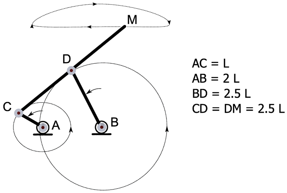 The length of these arms follow a certain propotion shown in the diagram; when the arm centered at point A rotates, point M moves in a near straight line. We'd hope to use the linkage the other way around in MEMS project and use the straight line force by MEMS actuator to generate rotational motion.