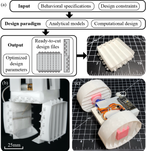 • Solutions: I have added demo figures into Fig. 1. I have also added one more paragraph in Intro section to discuss about the robotic side of contribution, which includes the robot car demo (moved it to the intro and concisely described it among other robotic applications). Last point in contributation section is expanded. "\textcolor{blue}{Beyond the foldable gripper, this computational design paradigm can be applied to boarder robotic community. To name a few: first, it can be applied to design various shapes of OADLC mechanisms with different mechanical specifications. For example, an origami-inspired foldable car derived from author's previous work \cite{mehta2014cogeneration} can be enhanced to gain more load-bearing capacity by replacing laminated wheels with computationally designed circular OADLC wheels (Fig.~\ref{fig: Intro_Figure}(c)). Second, it can be used to replace and customize building components for better performance. For example, in Liu \textit{et al.}, plastic corrugated sheets were used to build light weight self-folding robots \cite{liu2019self,liu2017self}. Though the corrugated sheets functioned well, they could be further customized to achieve desired rigidity while minimizing weight.}"