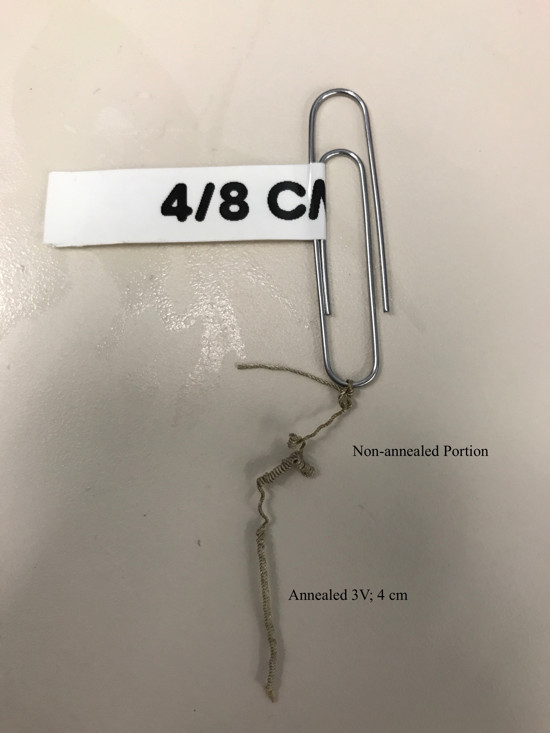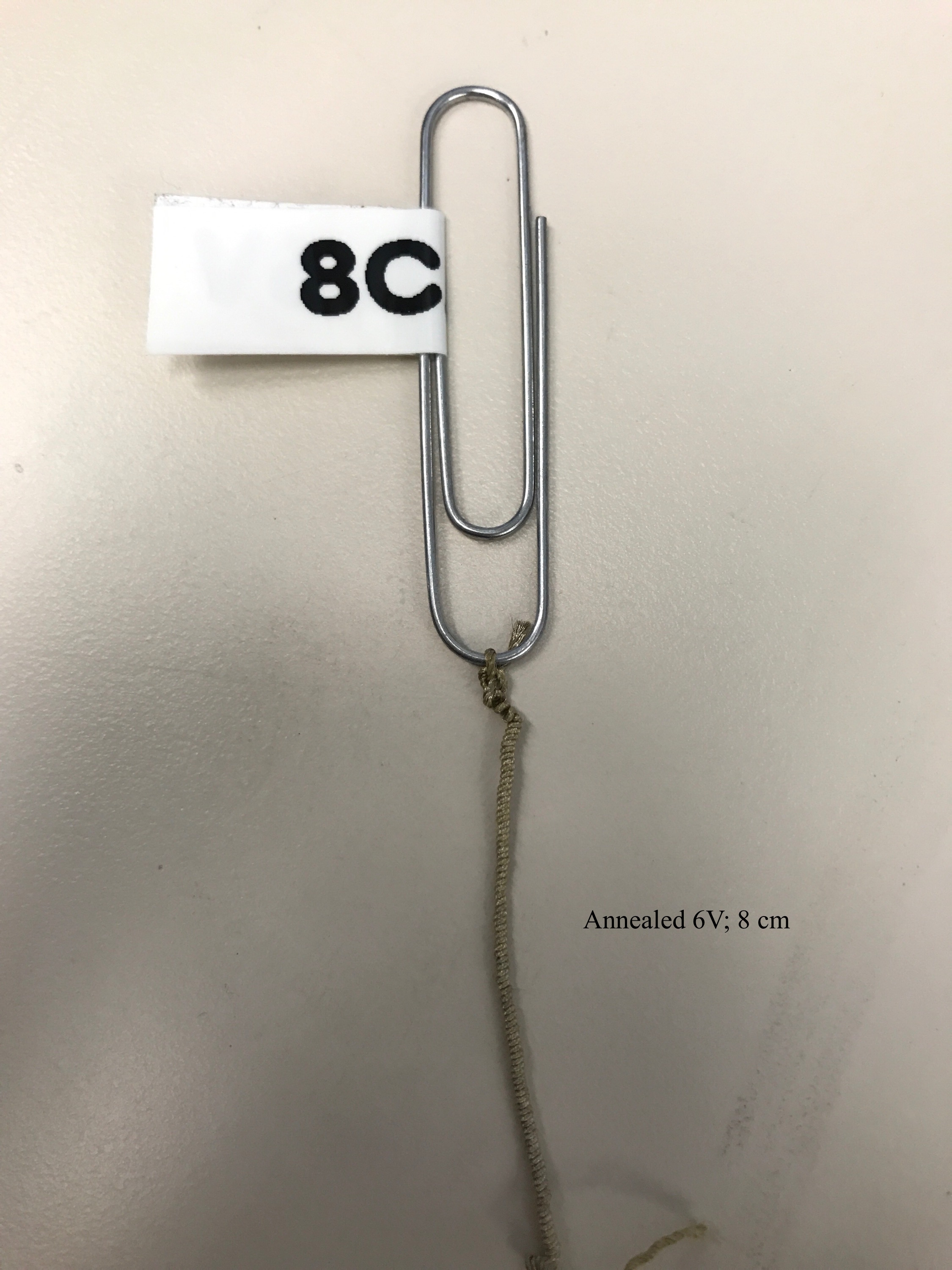 Therefore, we were able to determine that the experimental setup was indeed correct and there was a problem in the type of string used. Next, we used the 235/34 thread, which was also reported being used in some papers. From this thread we were able to successfully form coils in fibers of 30 cm precursor lengths. We used the same conditions (200 RPM, 100 grams) to insert the coils. The final length of the coiled actuator was 8 cm. We then attempted to anneal the actuators. Here are the pictures of the finalized actuators with the annealing conditions specified.