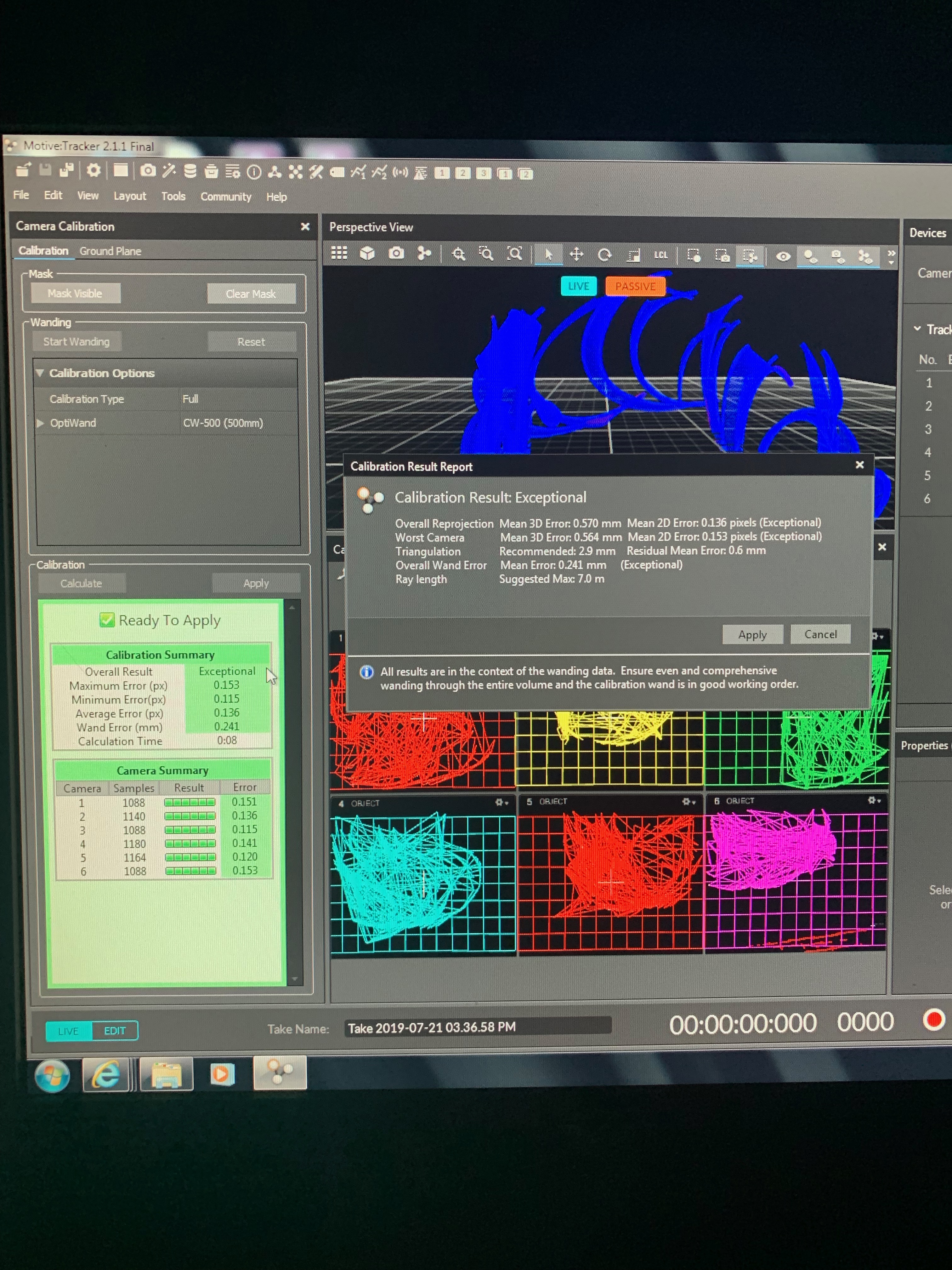 Calibration is essential for optical motion capture systems. During camera calibration, the system computes position and orientation of each camera and amounts of distortions in captured images. Using calibration data, Motive constructs a 3D capture volume. This video illustrates how to calibrat on motive. Also, the result of our calibration is attached.