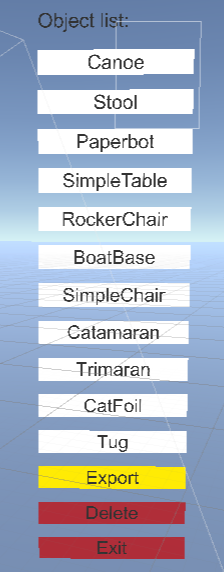 Current available objects could be roughly divided into three catagories: Furniture (Stool, SimpleChair, SimpleTable, RockerChair), Boat (BoatBase, Canoe, Catamaran, Trimaran, CatFoil, Tug), and Robot (Paperbot). In future work, the categories and available items can be extended, especially in Robot category. (as seen in the attached image)