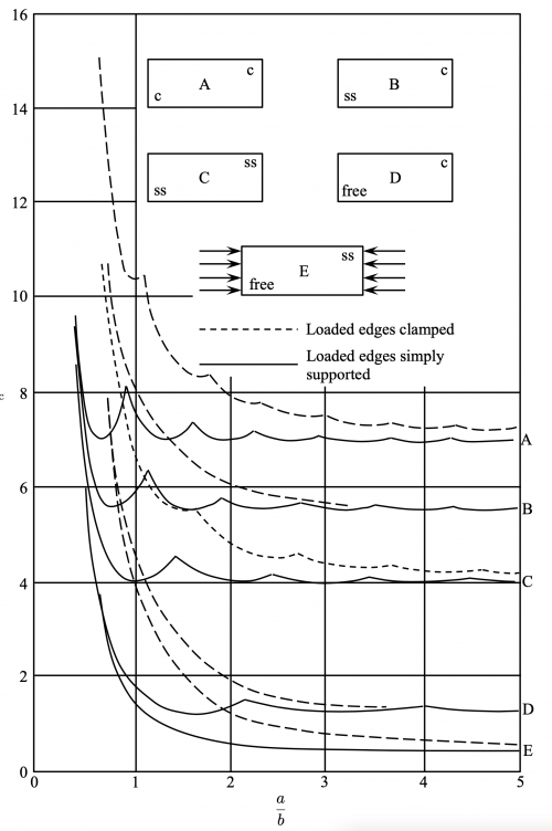 • "The unloaded edges of rectangular plates can be either simply supported (ss), clamped (c) or free. The loaded edges could be either simply supported or clamped. This gives rise to ten different combination. The buckling coefficient is plotted against the plate aspect ratio a/b." [1]