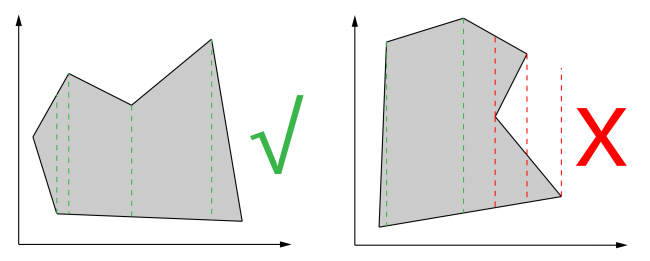 The current implement works for convex polygons, and concave polygons with concaves vertically, but not horizontally. For a simple example: