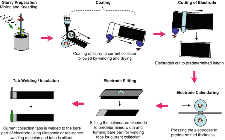 The first step is the electode fabrication, which includes slurry preparation, coating, cutting of electrode, electrode calendaring, electrode slitting, and tab weling/insulation, as shown in following figure.