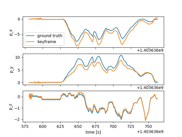 The output of visual odometry system constains the initial trajectory estimate and the initial landmark estimate. Currently, I obtained the initial trajectory estimate. The comparison to the groundtruth data is in the following. (Keyframe stands for the output of the visual odometry system.)