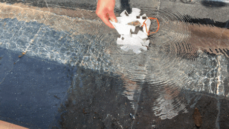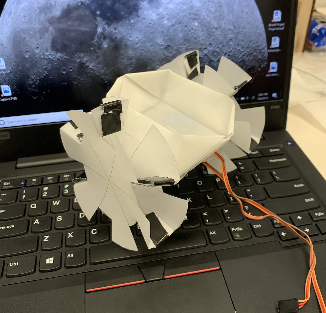 With Boat 5, we tested a different method of constructing the pinwheels. Since the first prototype's pinwheels involved twisting and punching small holes in the plastic, they were difficult to construct. We simplified the pinwheel structure by using only cutting, folding, and taping, so that we can use RoCo in the future to design and print out boats.