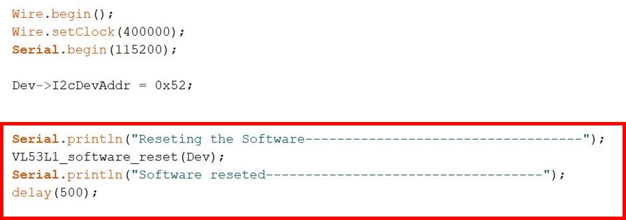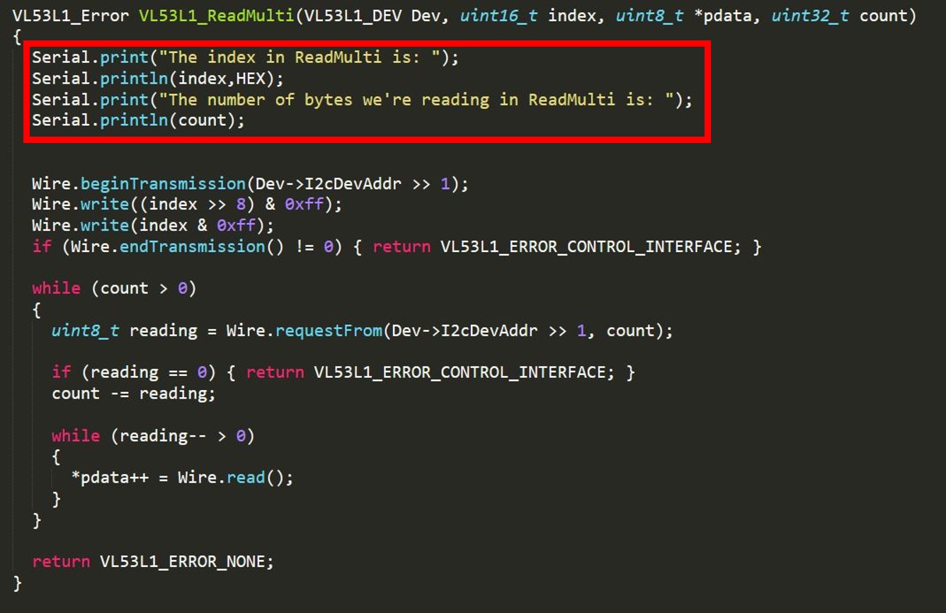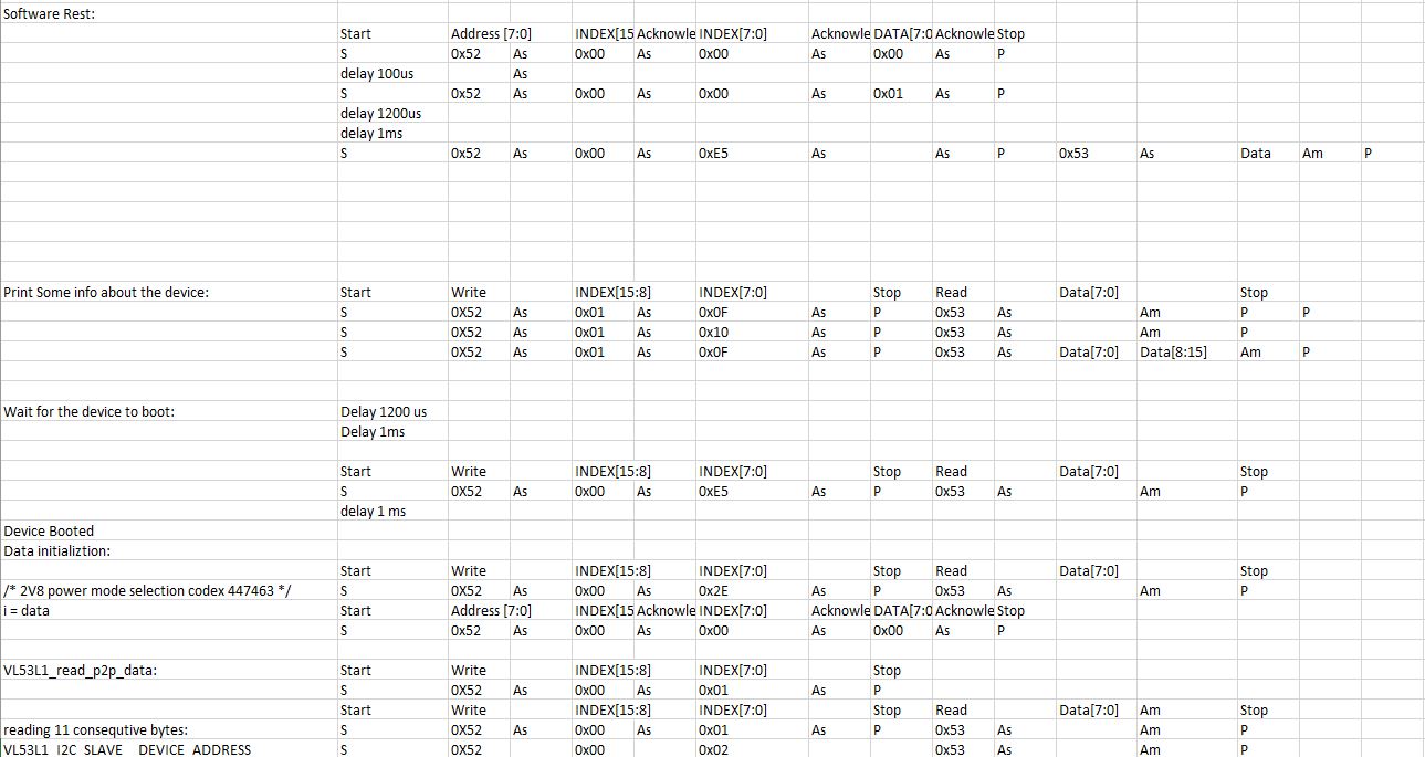 Throughout this past week, I was able to use all the knowledge collected from the previous weeks which I have discussed in my previous blogs and generate a table that lists all the I2C communication which happens sequentially between the microcontroller and the Vl53L1X sensor. I added Serial.print functions within the functions of the Platform class from the ST’s library. The reason to do so was that the Platform functions act as a gate between the ST’s API and I2C calls. Therefore, the added print functions print out every single internal index call and the amount of data that is being transferred in the I2C lines during the distance reading run time. Using this method, I was able to monitor every single byte transmitted to/from the sensors and I can get a good idea to write my code which will use only I2C commands to perform the same task!