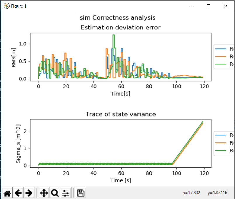 I've successfully gotten the pre-generated data simulation to run correctly for robots moving in a straight line. I used the already-built animated plotting api to view the results in addition to looking at the analyzer outputs. During the debugging process, we discovered that the simpleEKF algorithm implemented with Colo was not working correctly. The next step is to debug the circular path simulation and simpleEKF. The figures below were generated using CentralizedEKF.