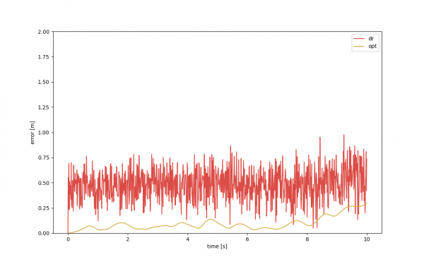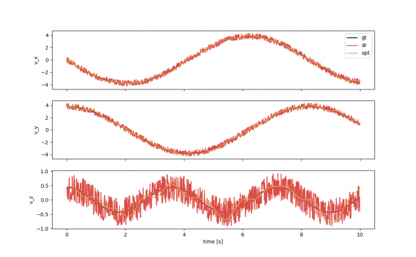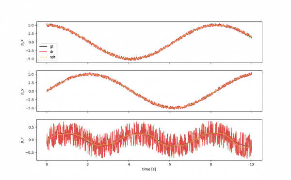 The below figures show the ground truth (gt, black), a noisy dead reckoning signal (dr, red), and an NLS optimization using the noisy dr as a seed, and IMU data to constrain relative motion.