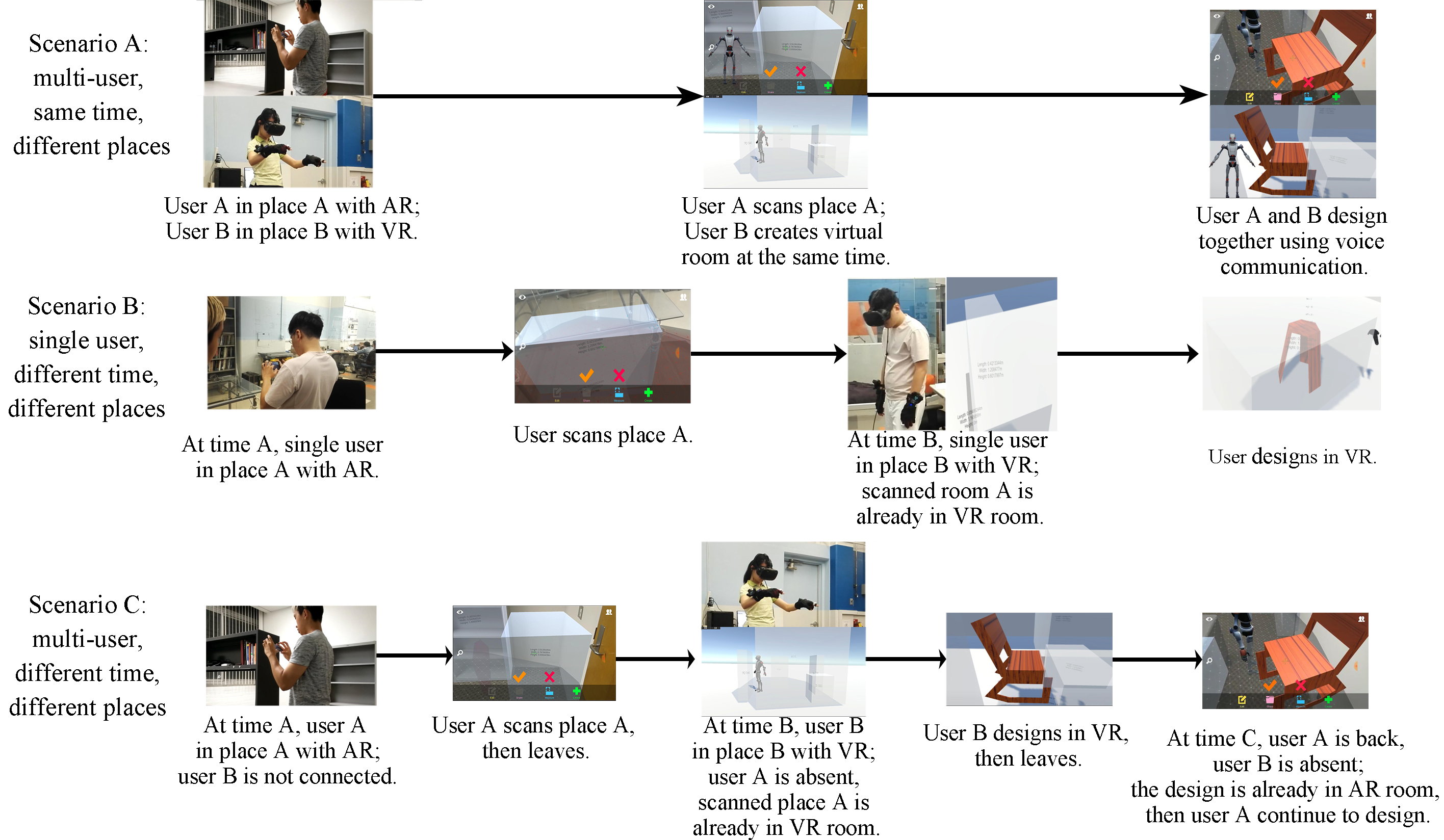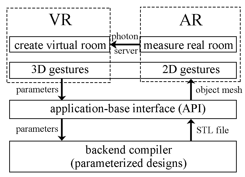 This system combines advantage of AR and VR together to make non-designer easier and more comfortable to design - in our example case - is to design parameterized furniture in real or virtual room.