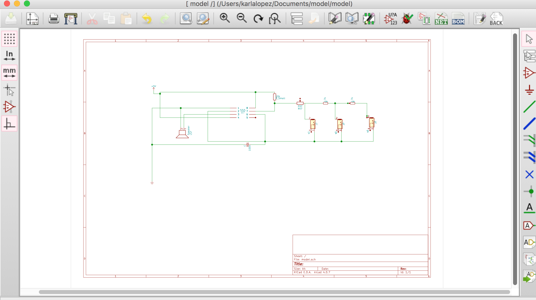 KiCAD's library does not have a 555 timer component so I was able to explore its capabilities and build one of my own. After I had created this component from looking at its datasheet, I was able to construct the schematic for the circuit.